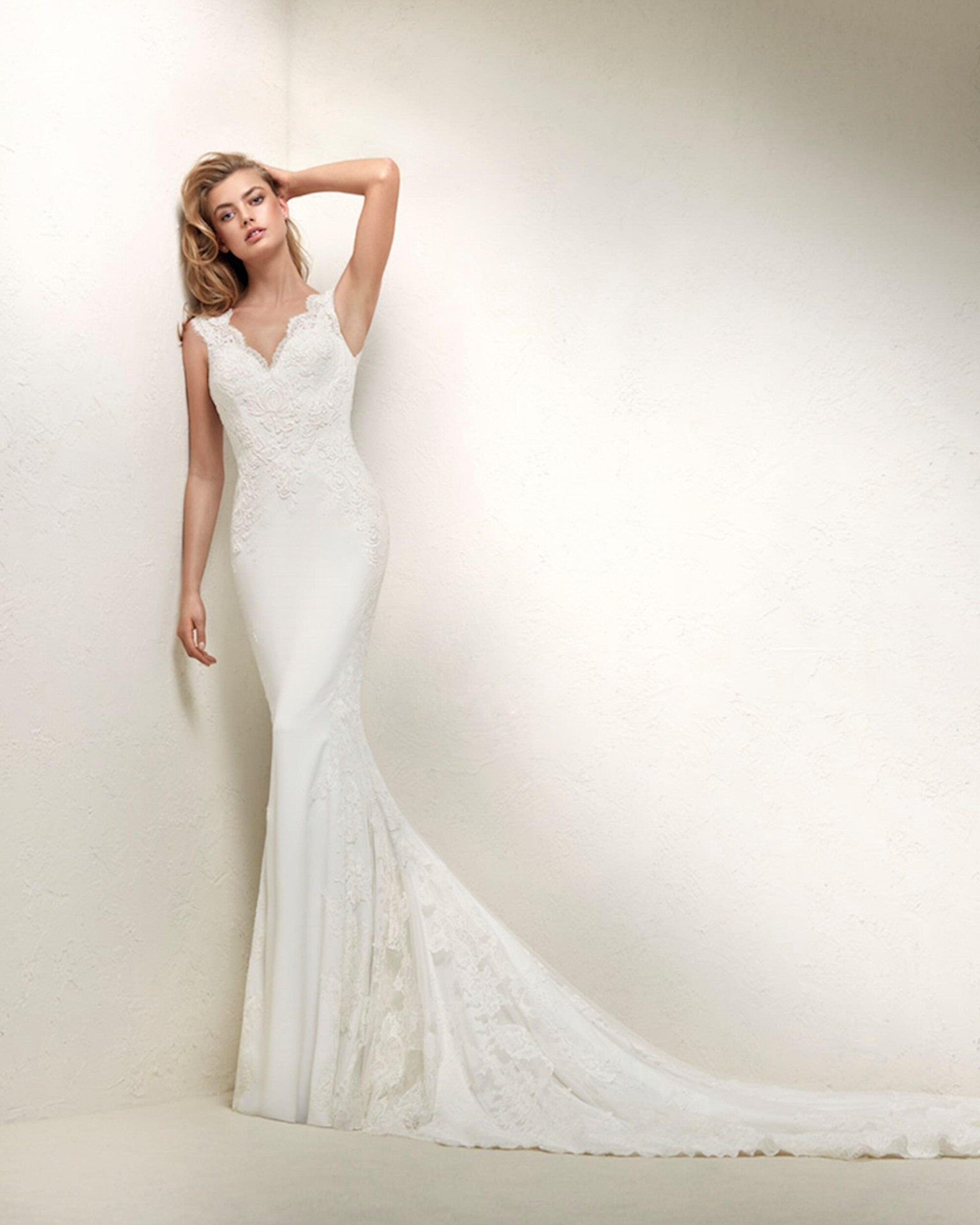 The DRUSILA V-Neck Crepe and Lace Wedding Dress is a stunning choice for any bride-to-be. This dress is designed to make you feel confident and beautiful on your special day.