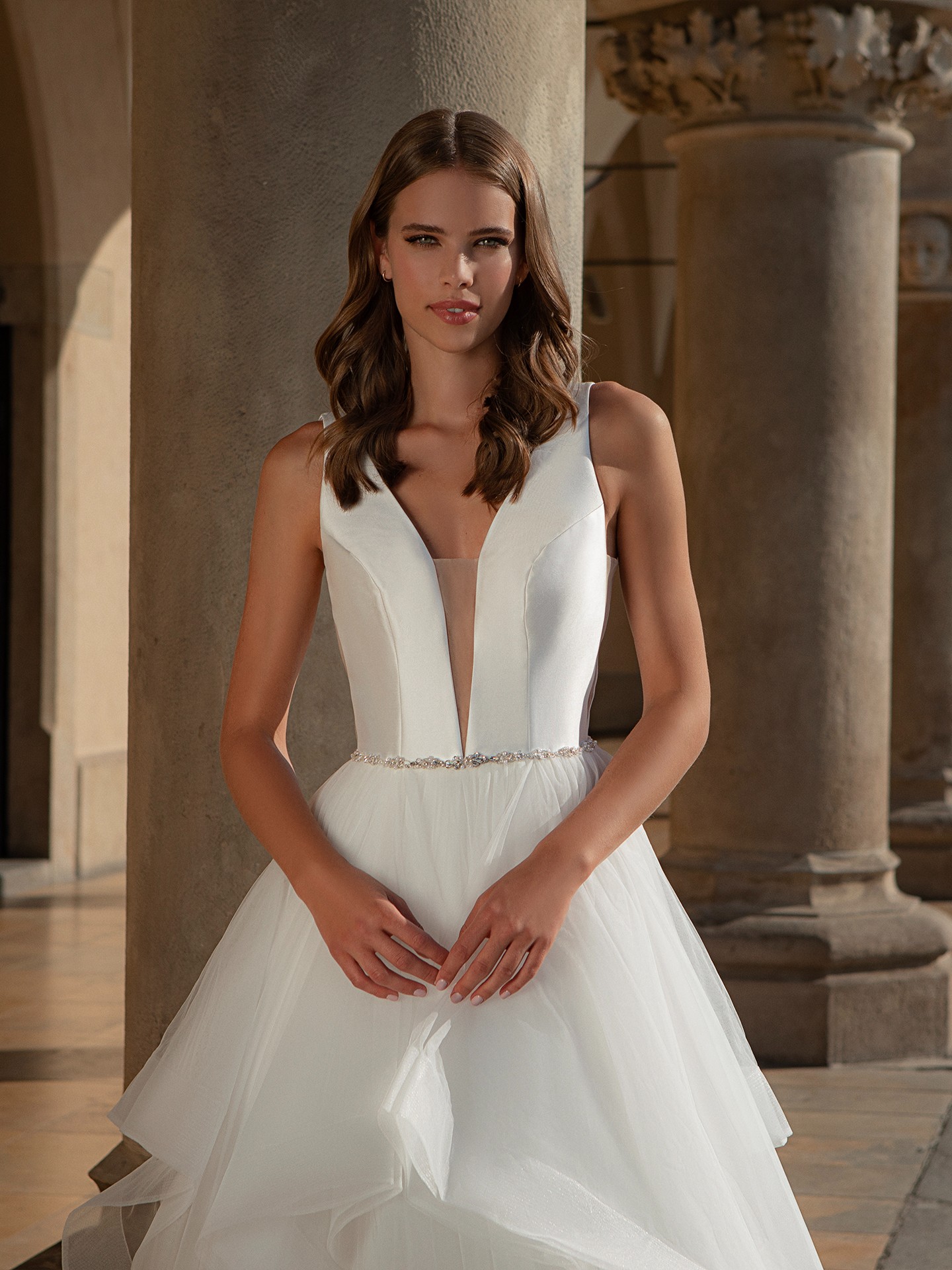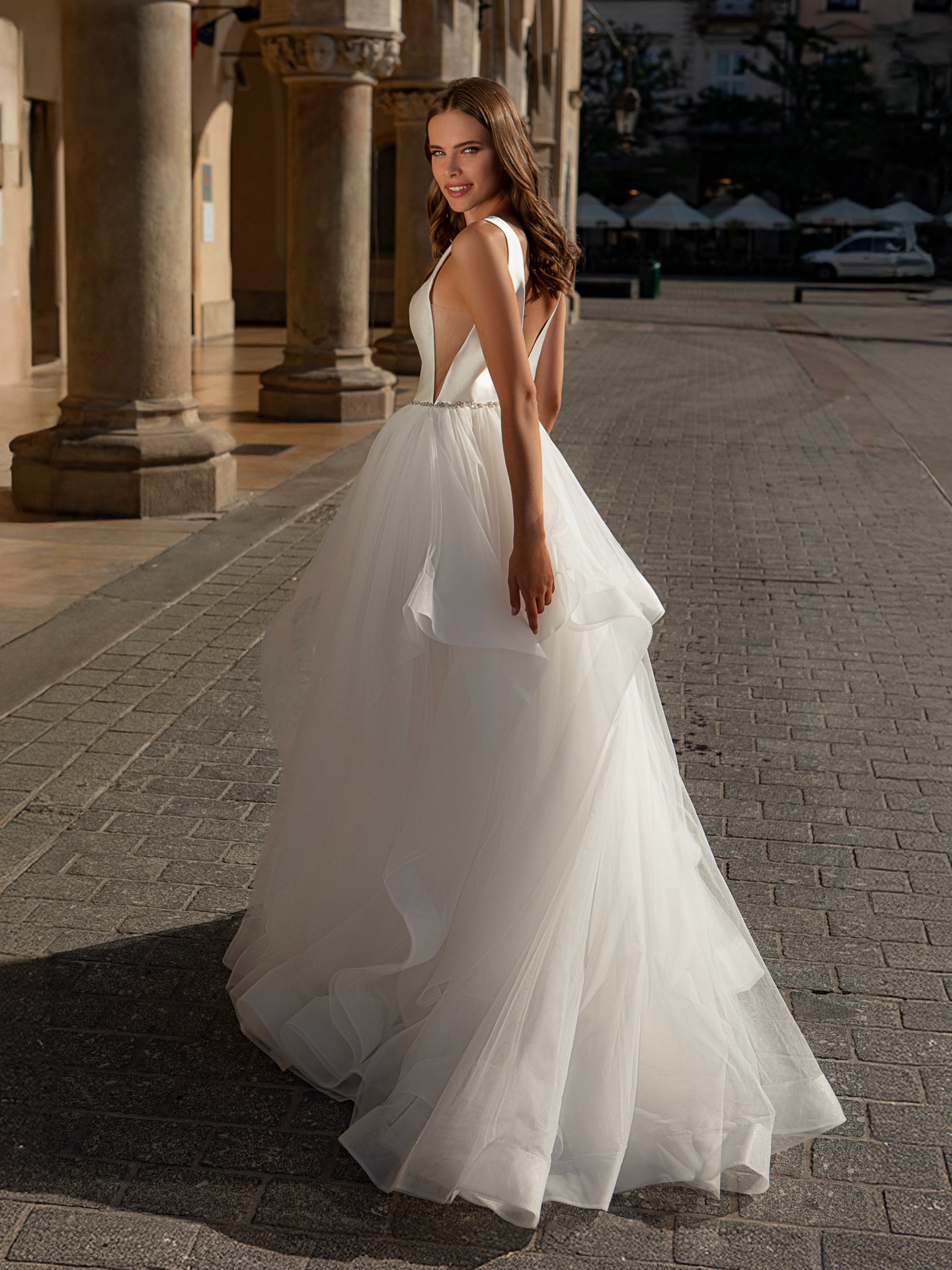 - The tulle overlay adds a softness and ethereal quality to the dress, making it perfect for a dreamy outdoor wedding or a more formal indoor affair.