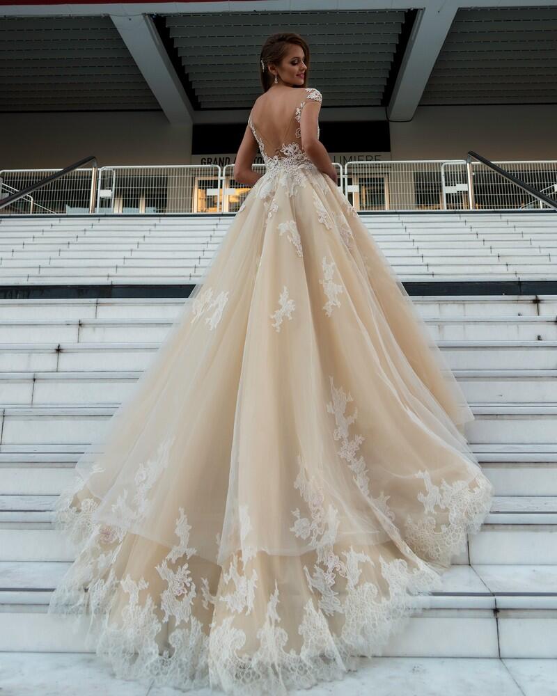 - The lace detailing is intricate and delicate, adding a romantic and feminine touch to the dress.