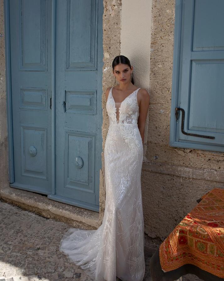 - The Glasgow Embroidered V-Neck Lace Sheath Wedding Dress is the perfect choice for any bride who wants to feel beautiful, elegant, and confident on her wedding day.