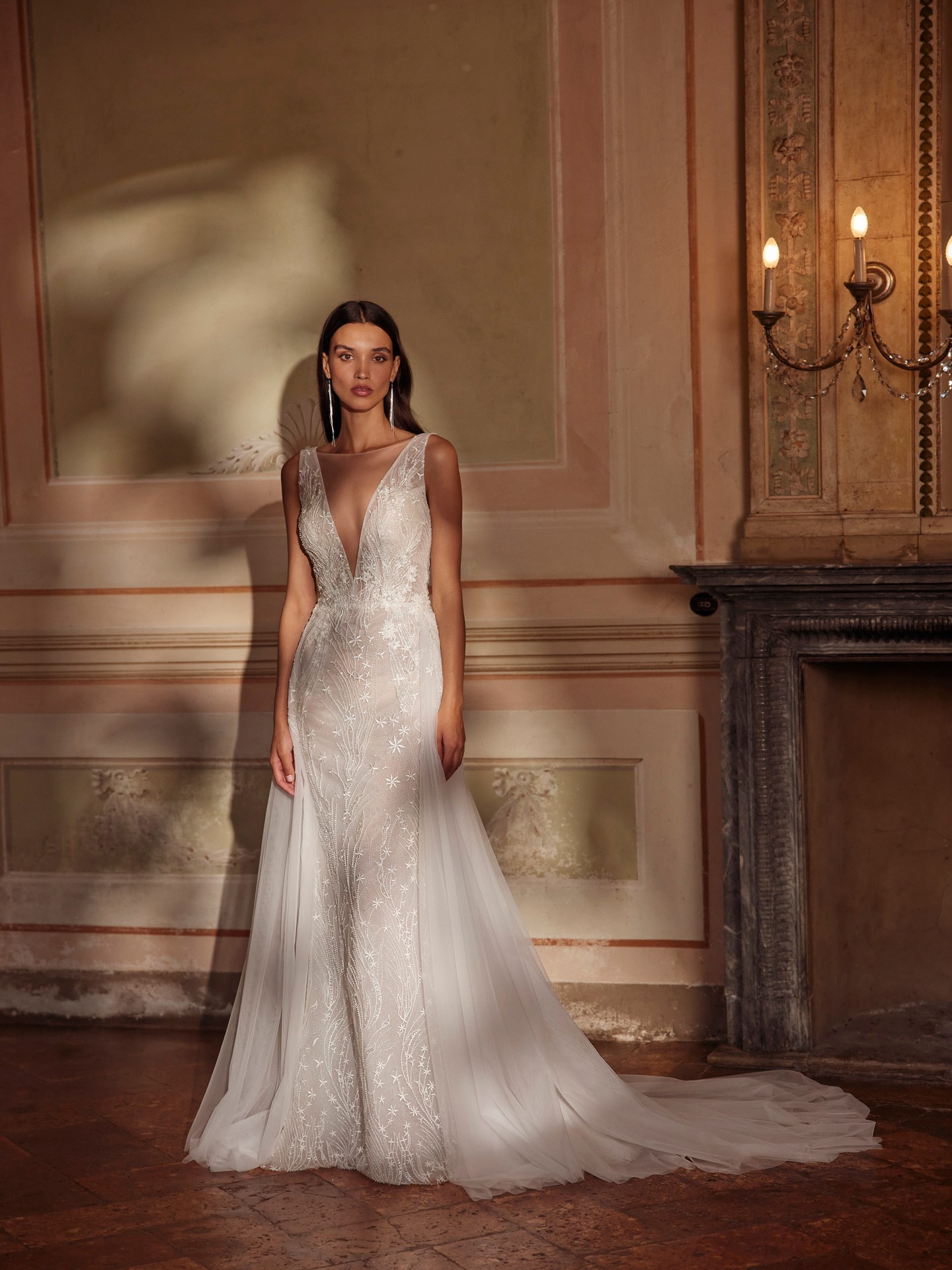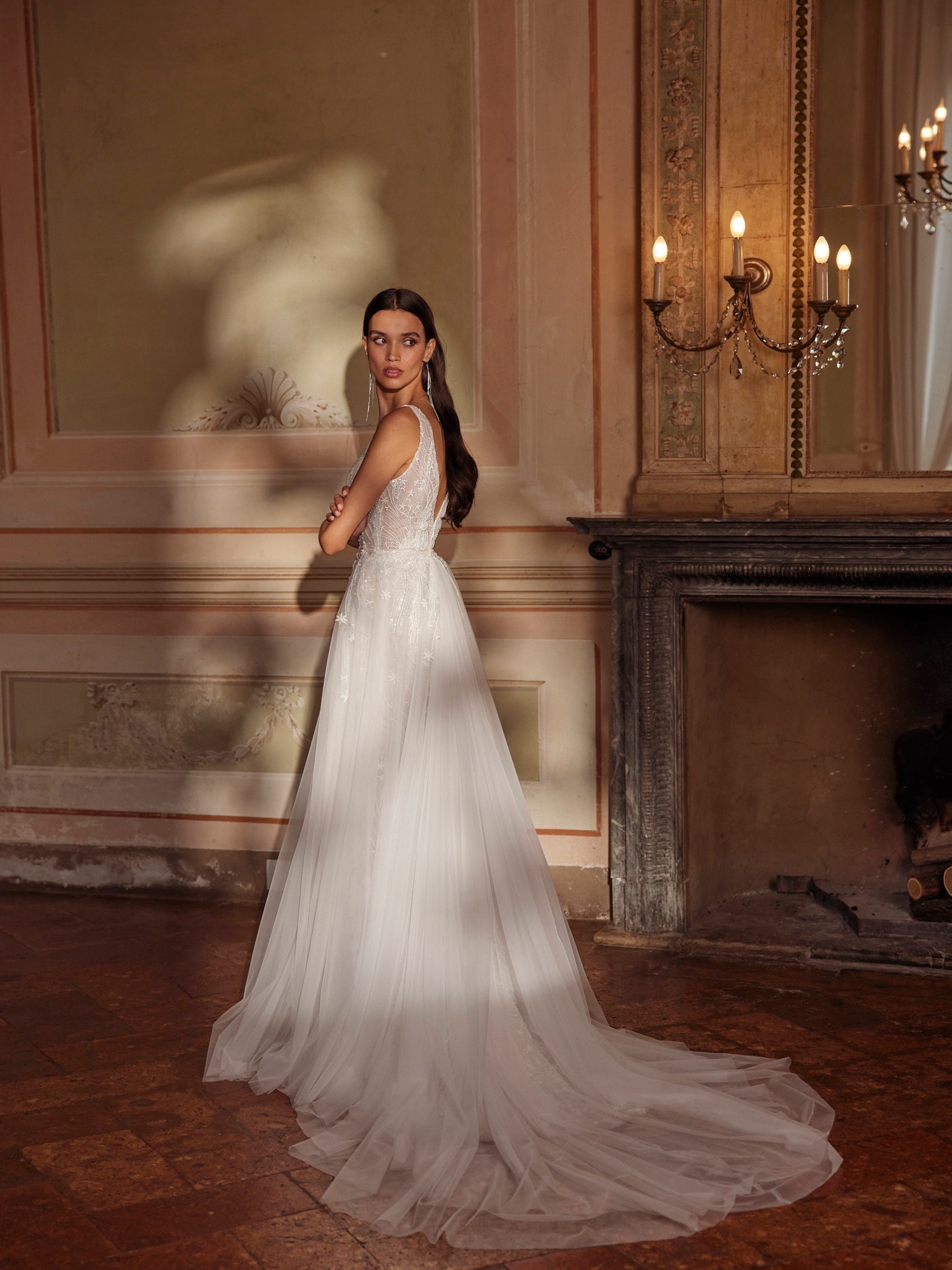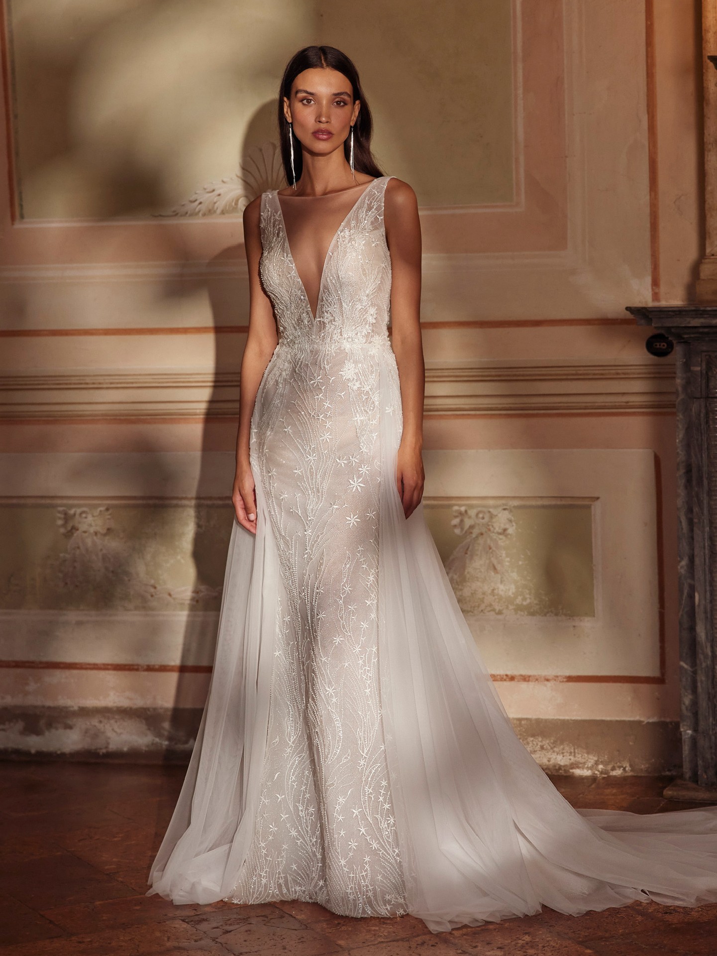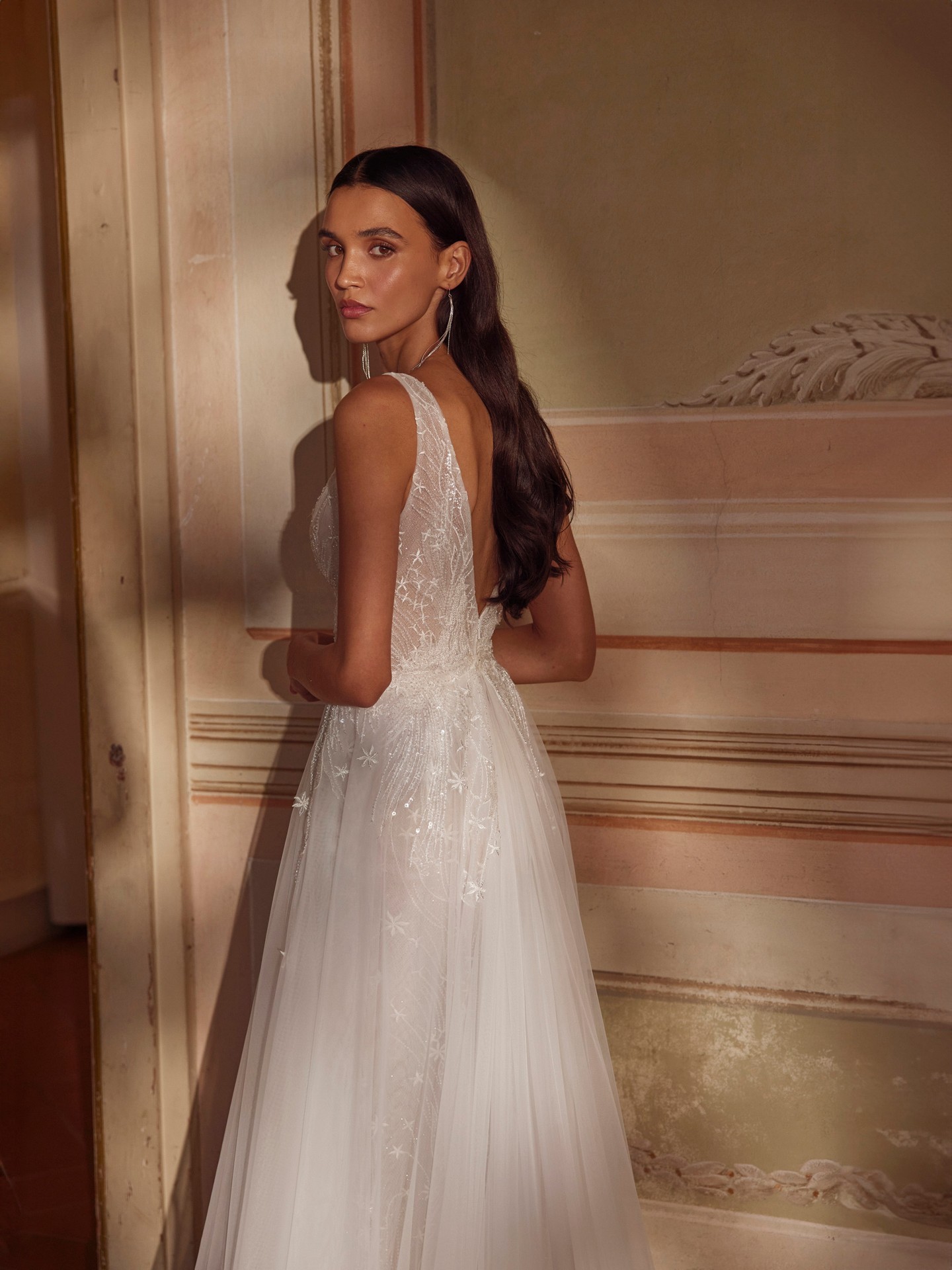 Meet IDA — an elegant A-line wedding dress crafted to shine in every photo. A sculpted tank-style V-neck bodice with subtle sparkle defines the waist before flowing into a soft tulle skirt that ends in a graceful chapel train. The clean V-back mirrors the neckline for a modern, elongating line, while lightweight layers keep the gown comfortable from aisle to first dance. Refined, romantic and effortlessly flattering.