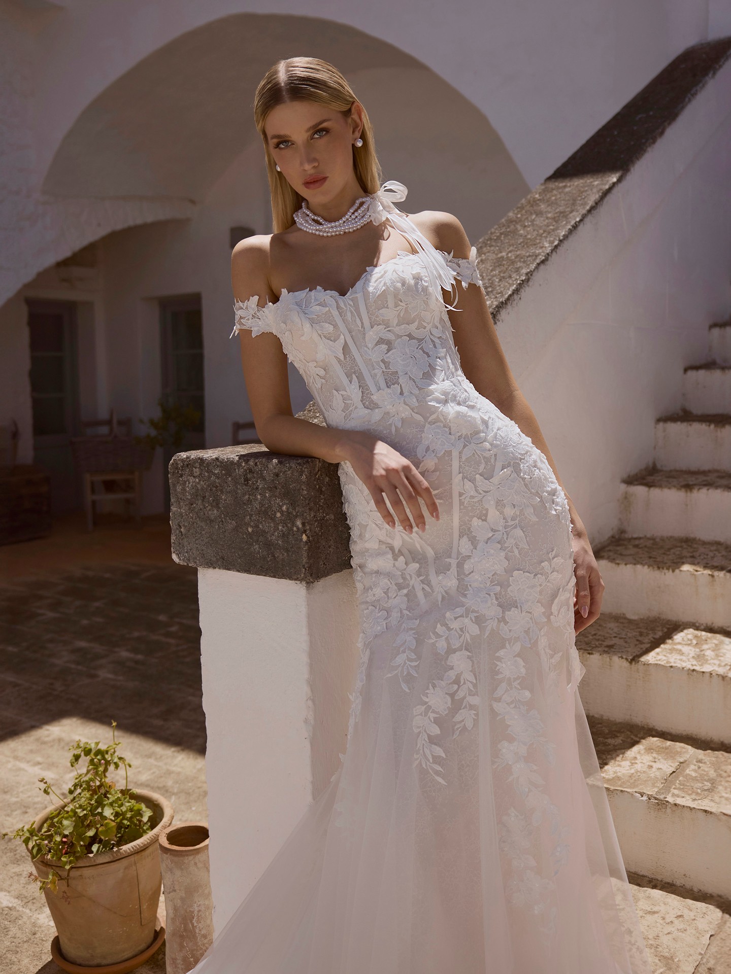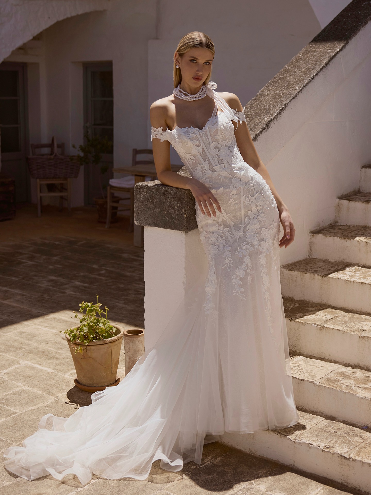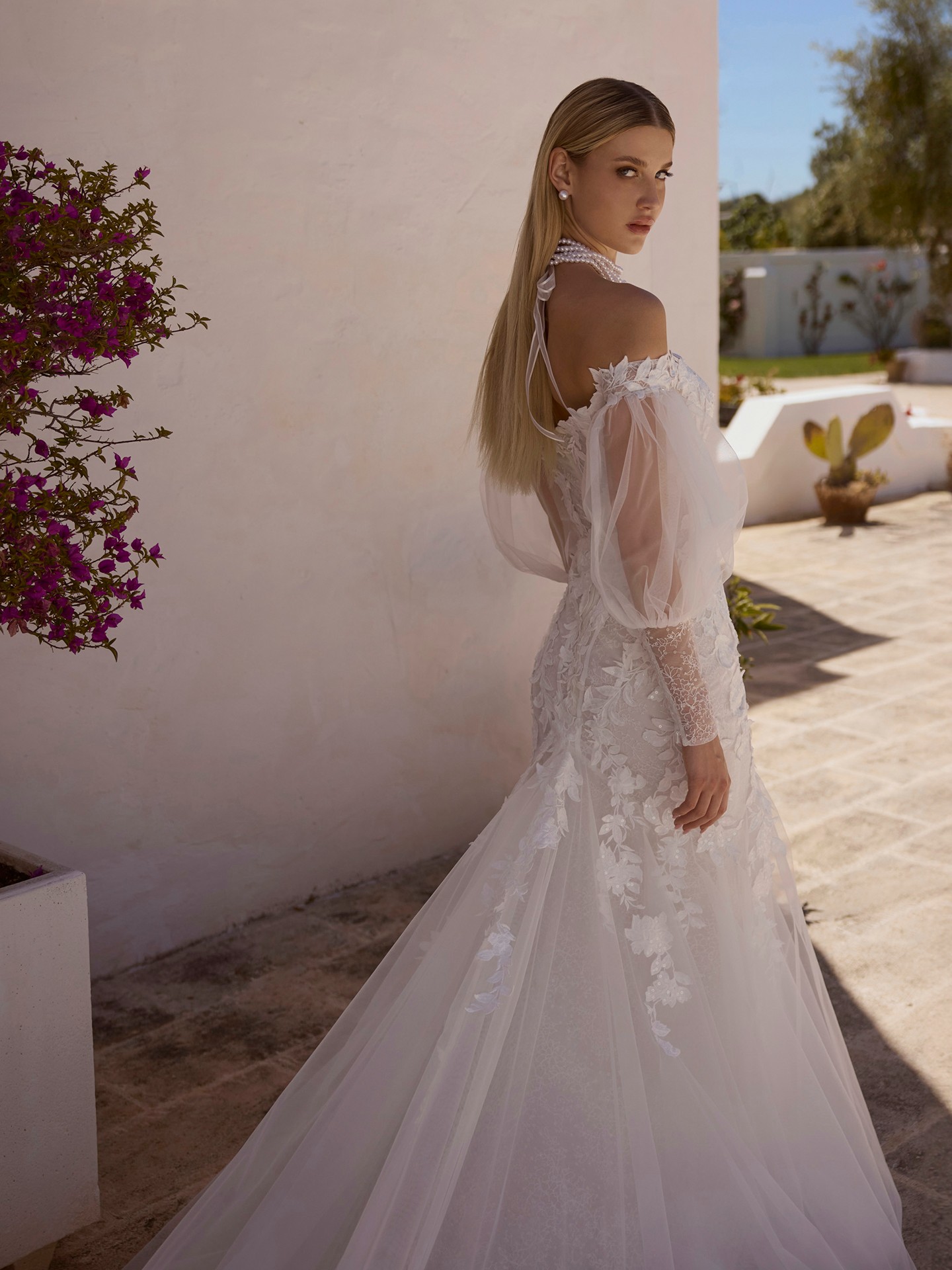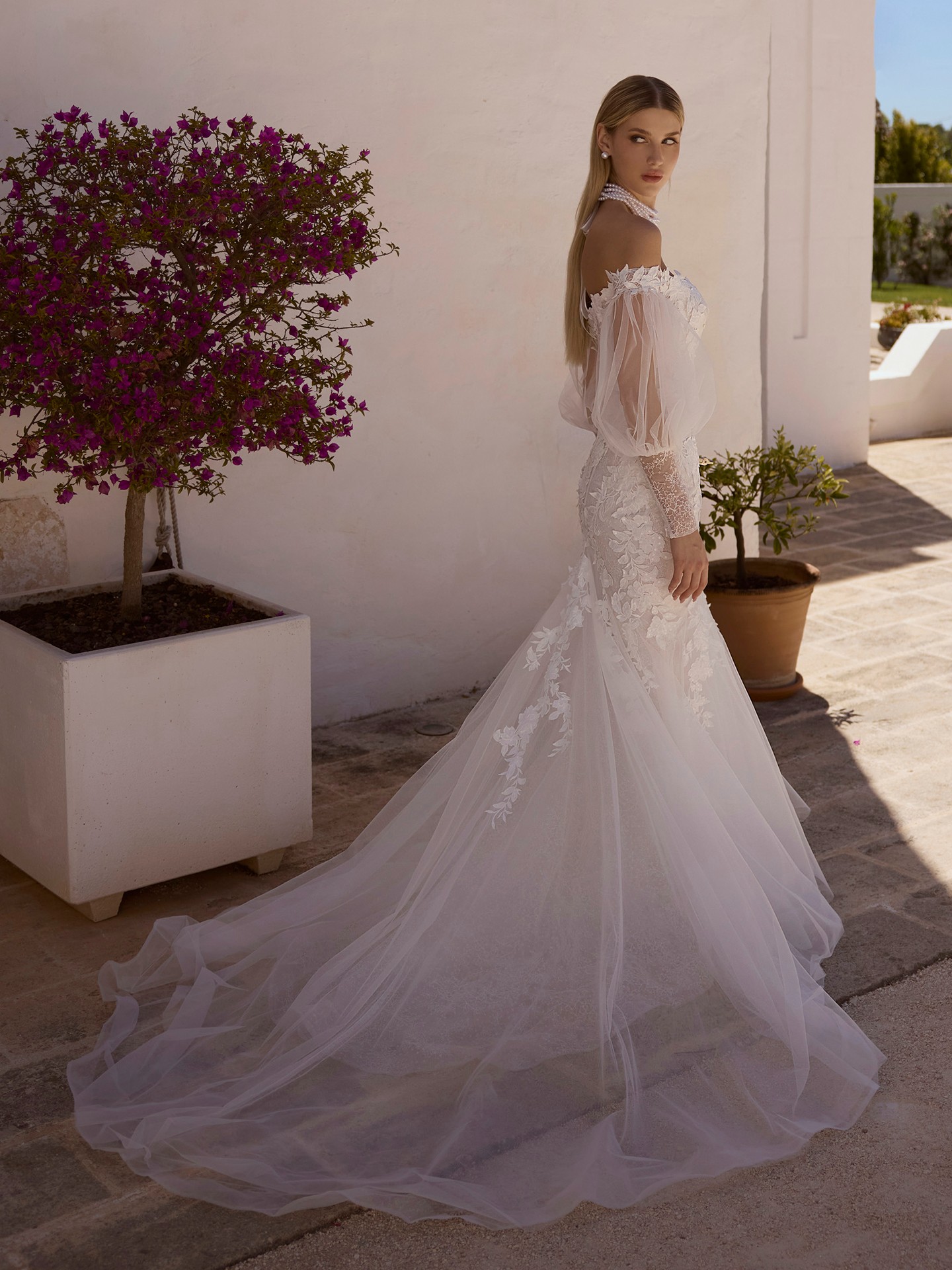 The romantic off-the-shoulder wedding dress JOLANTA is an elegant choice for a bride seeking sophistication and refinement.