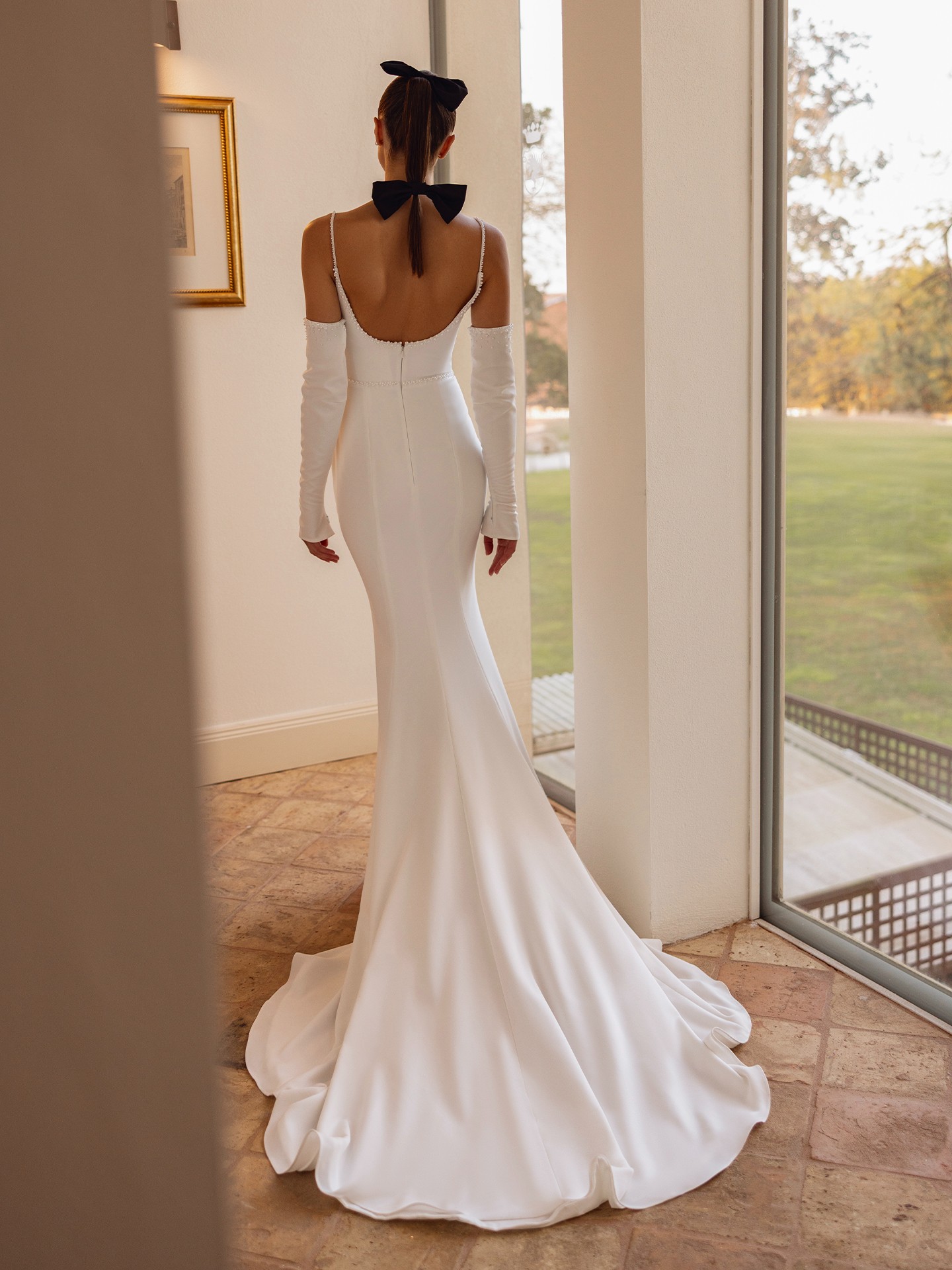Jestem absolutnie zachwycona tą suknią ślubną! Fason typu rybka pięknie podkreśla sylwetkę, a delikatne, cienkie ramiączka dodają jej subtelności i kobiecego uroku. Materiał z krepy wygląda bardzo elegancko i szlachetnie. Suknia jest prosta, ale jednocześnie niezwykle stylowa – idealna dla panny młodej, która ceni klasę i ponadczasową elegancję. Czułam się w niej wyjątkowo! ✨👰