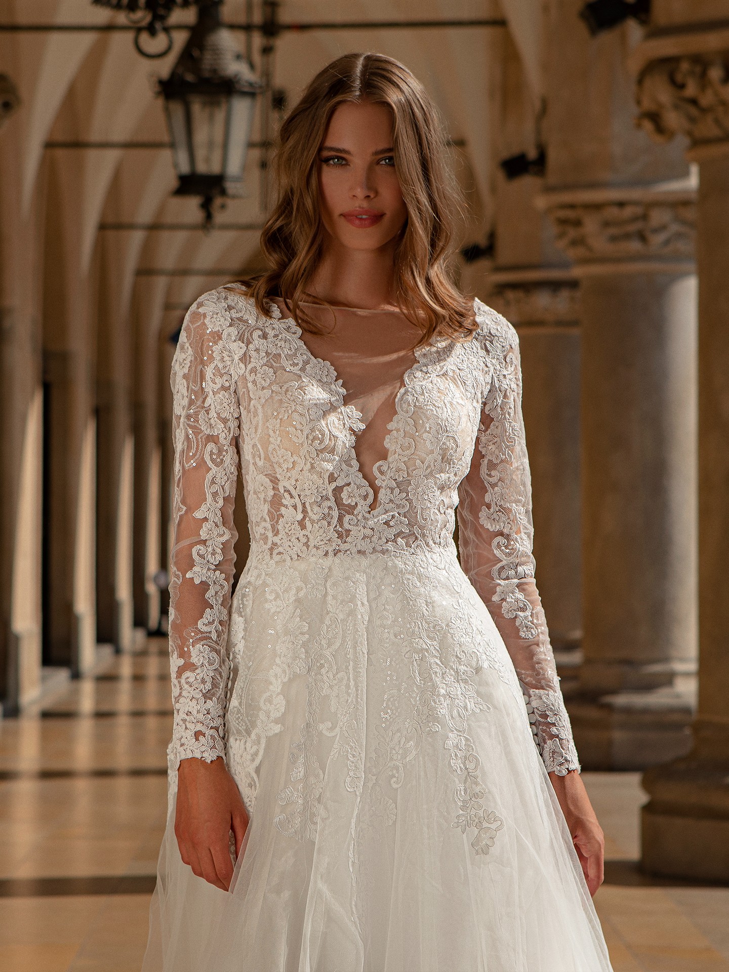 This stunning Long Sleeve illusion plunge v-neck Lace A-line Wedding Dress #10028 is the perfect choice for any bride looking for a classic and elegant look on her special day. The delicate lace detailing and A-line silhouette create a timeless and romantic feel, while the illusion plunge v-neck adds a touch of modern sophistication.
