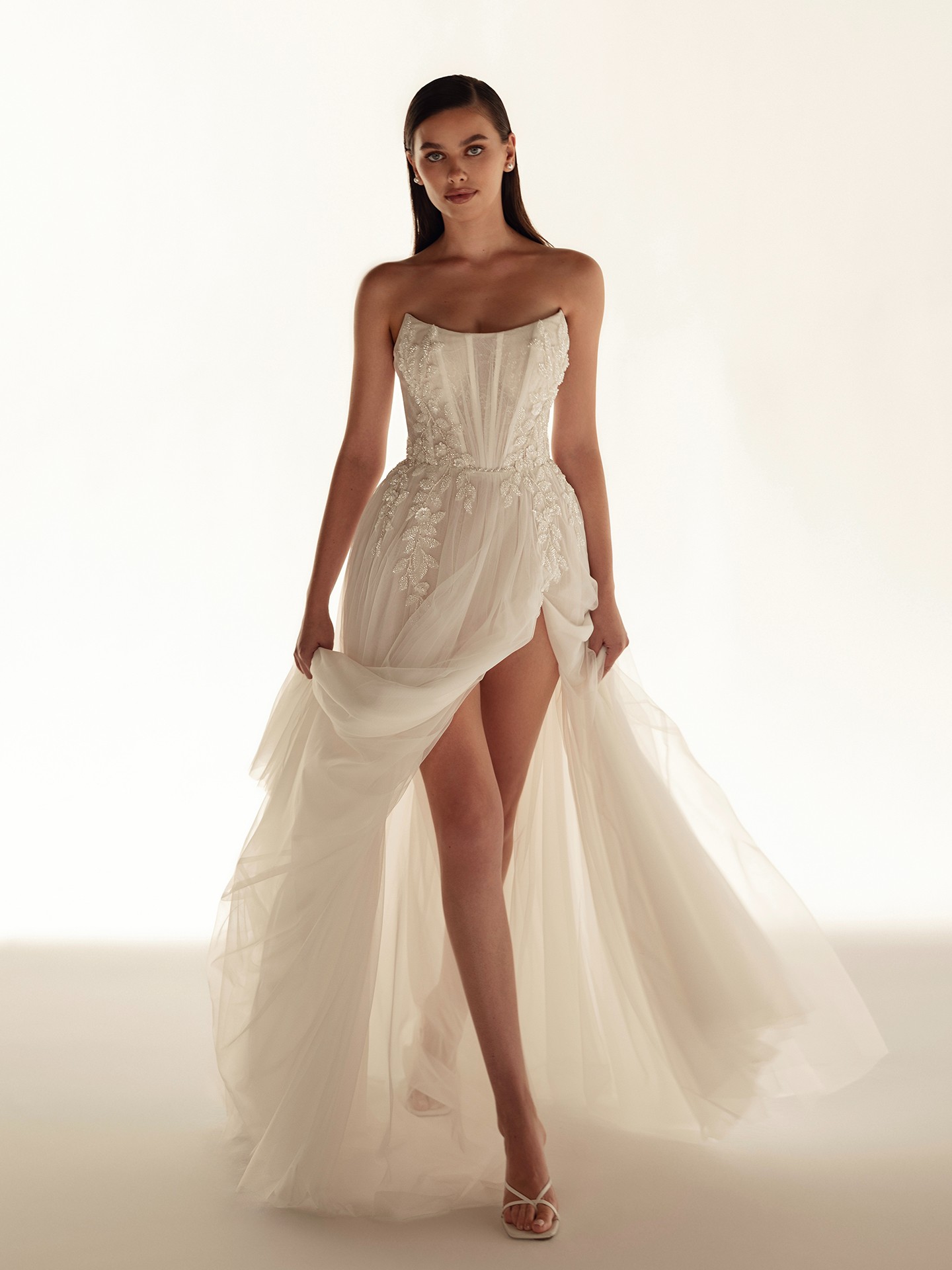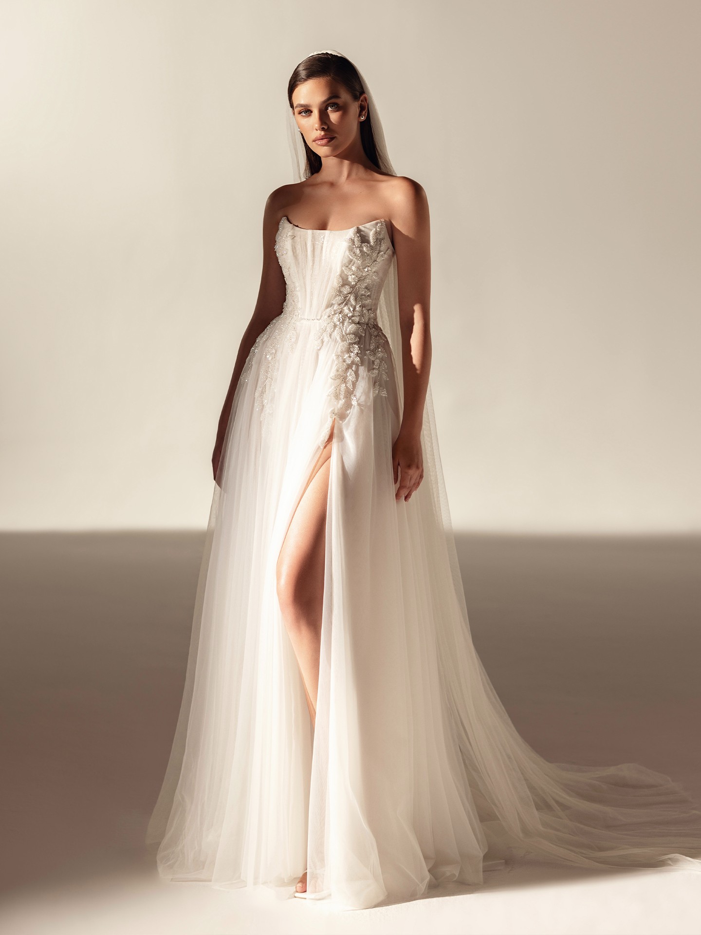 LUCKY Romantic Wedding Dress - Sheath Court Train Strapless Neckline with Floral Lace Applique Bridal Gown
