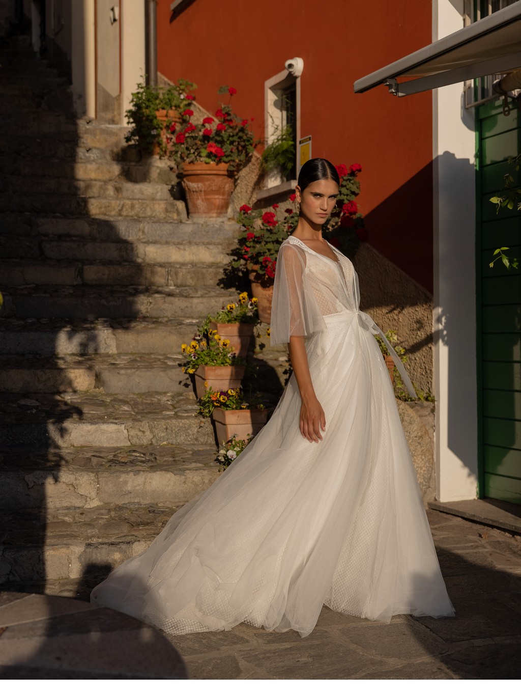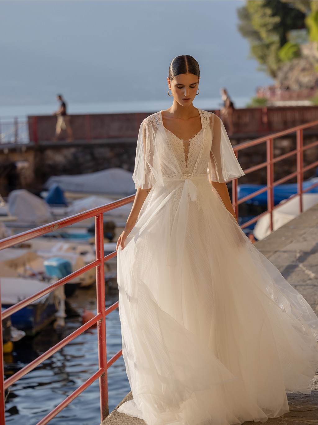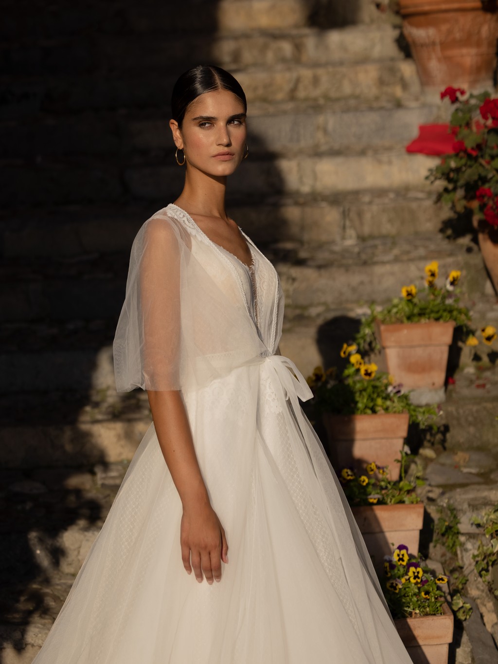 - The soft tulle overlay on the skirt creates a dreamy, ethereal effect that will make you feel like you're floating down the aisle.