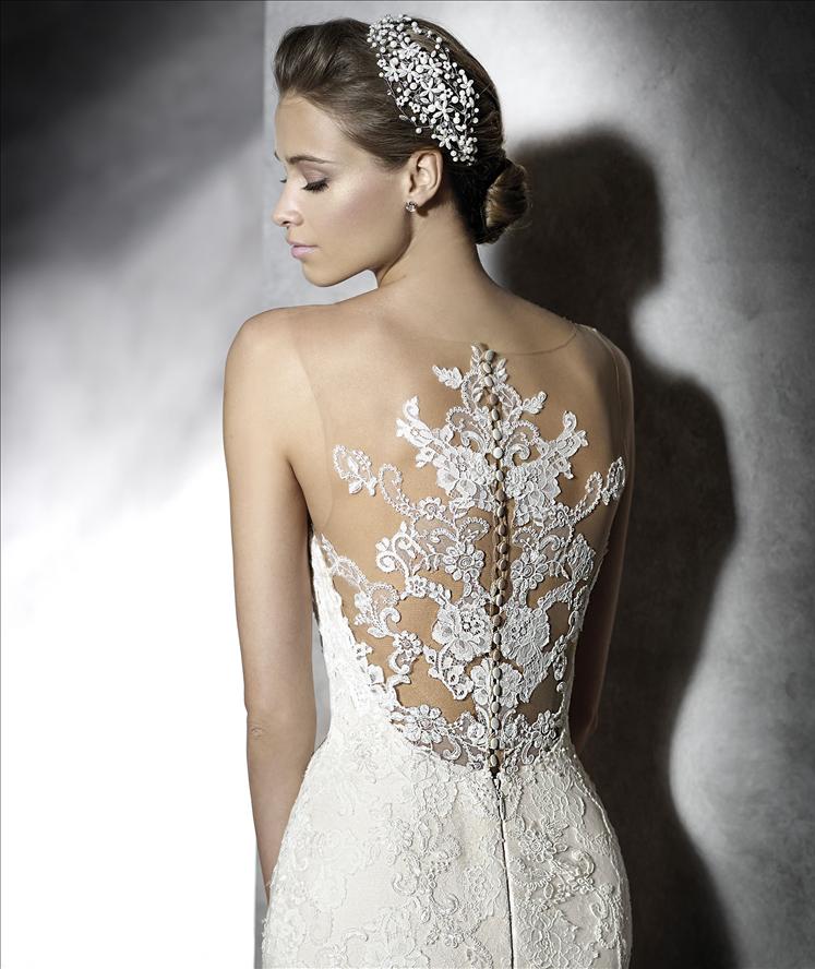 - The back of the dress is just as stunning as the front, with a low-cut design and intricate lace detailing.