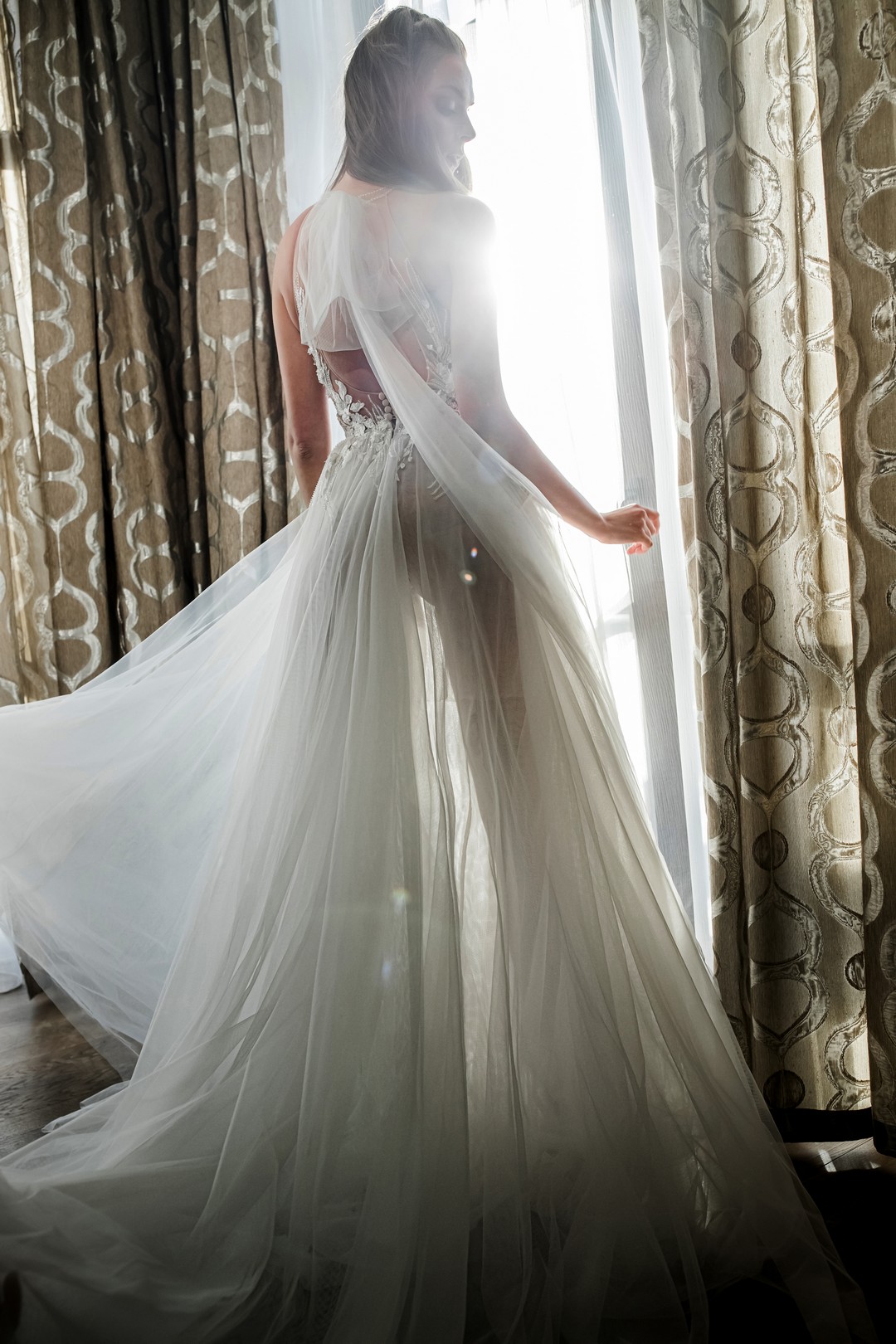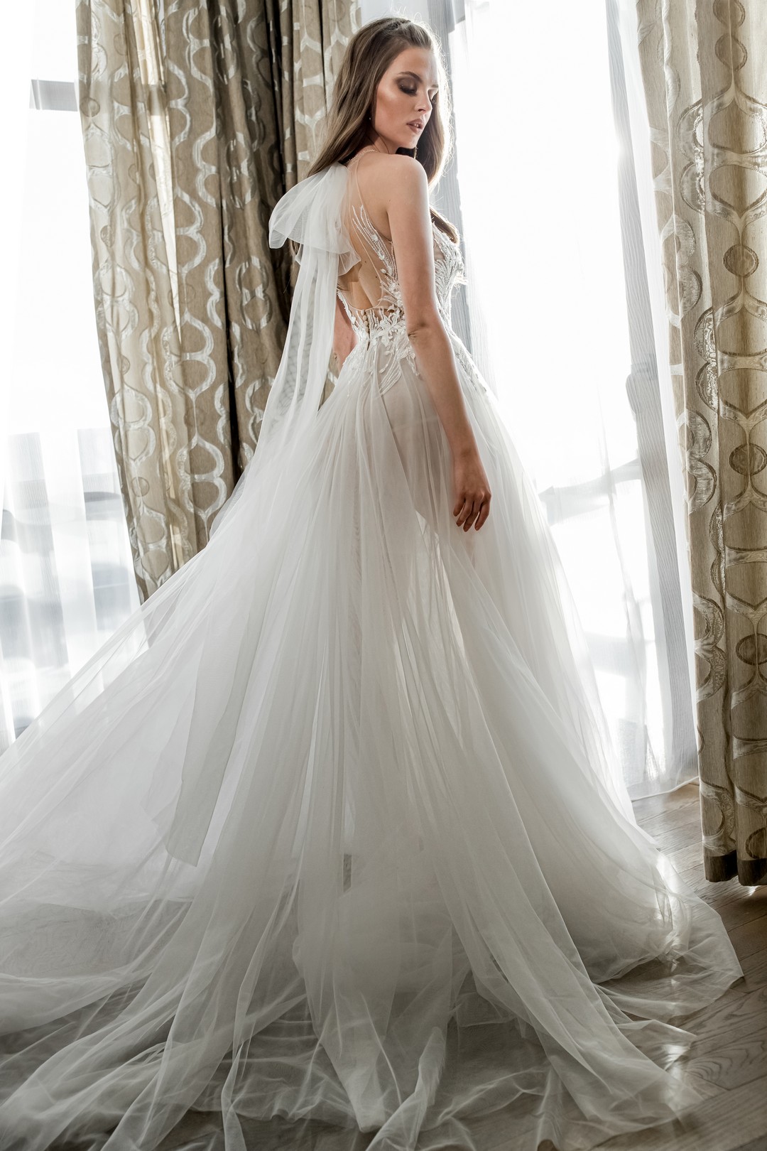 Light as air and effortlessly romantic, RIO (by Lite) blends a modern illusion bodice with timeless A-line proportions. A semi-sheer corset on fine mesh shapes the figure and frames a plunging V-neckline, while hand-placed lace appliqués and delicate embroidery define the waist. The skirt in soft tulle floats with every step and extends into a graceful chapel-length train. A deep V back with halter-style cutaway adds a contemporary touch. Rendered in flattering ivory, the dress is sleeveless and strap-free so nothing distracts from the clean, elongated silhouette.