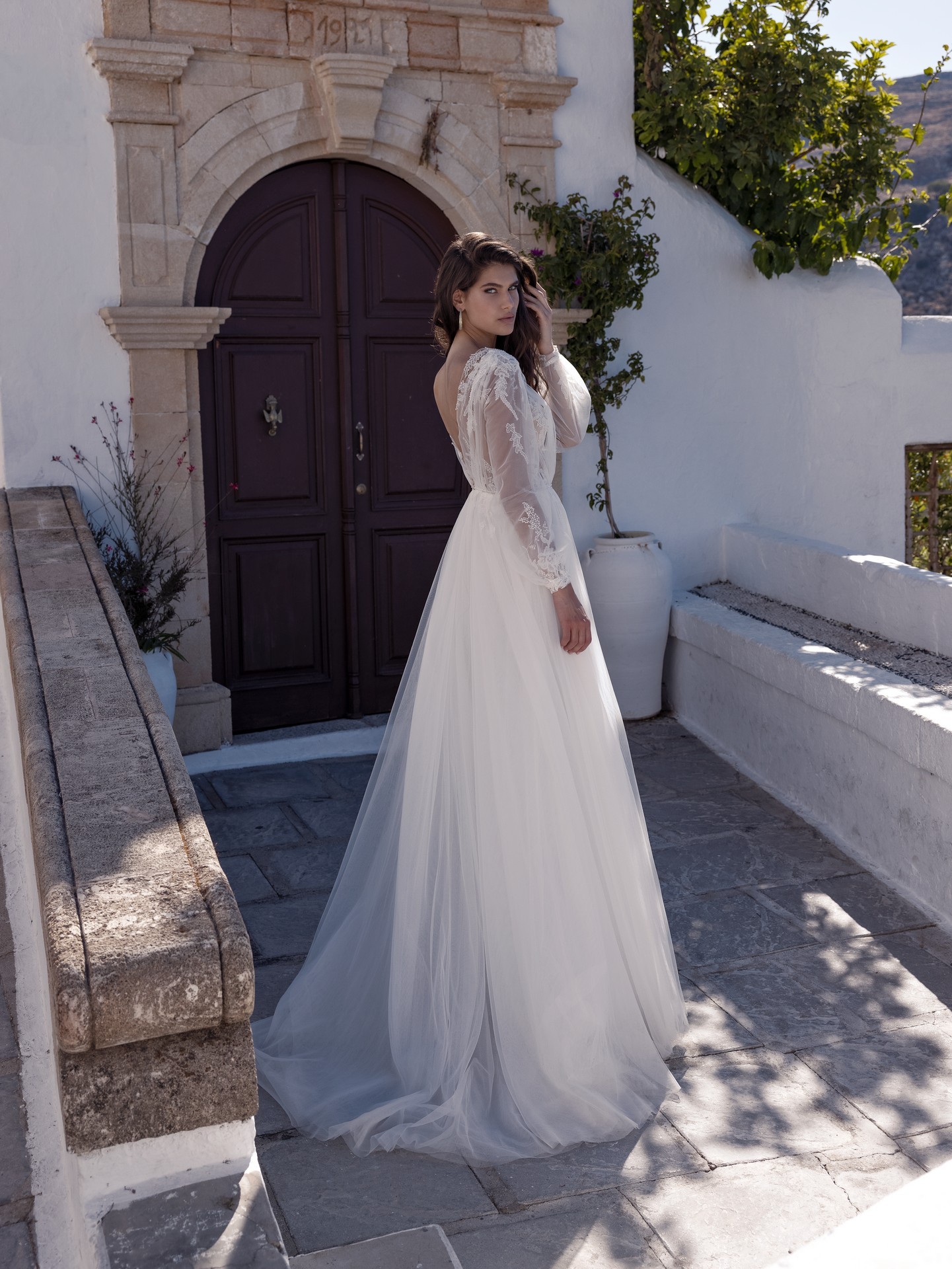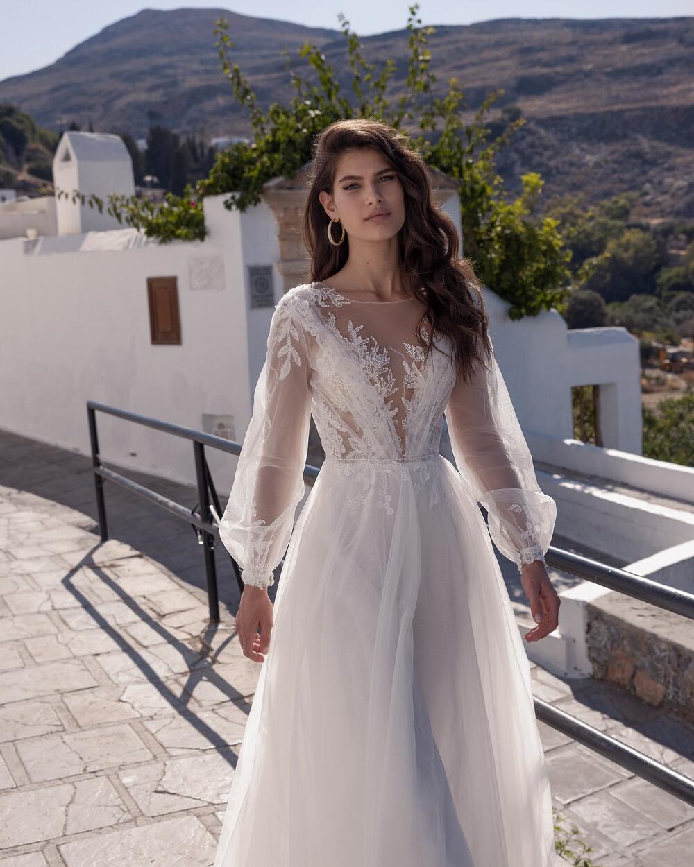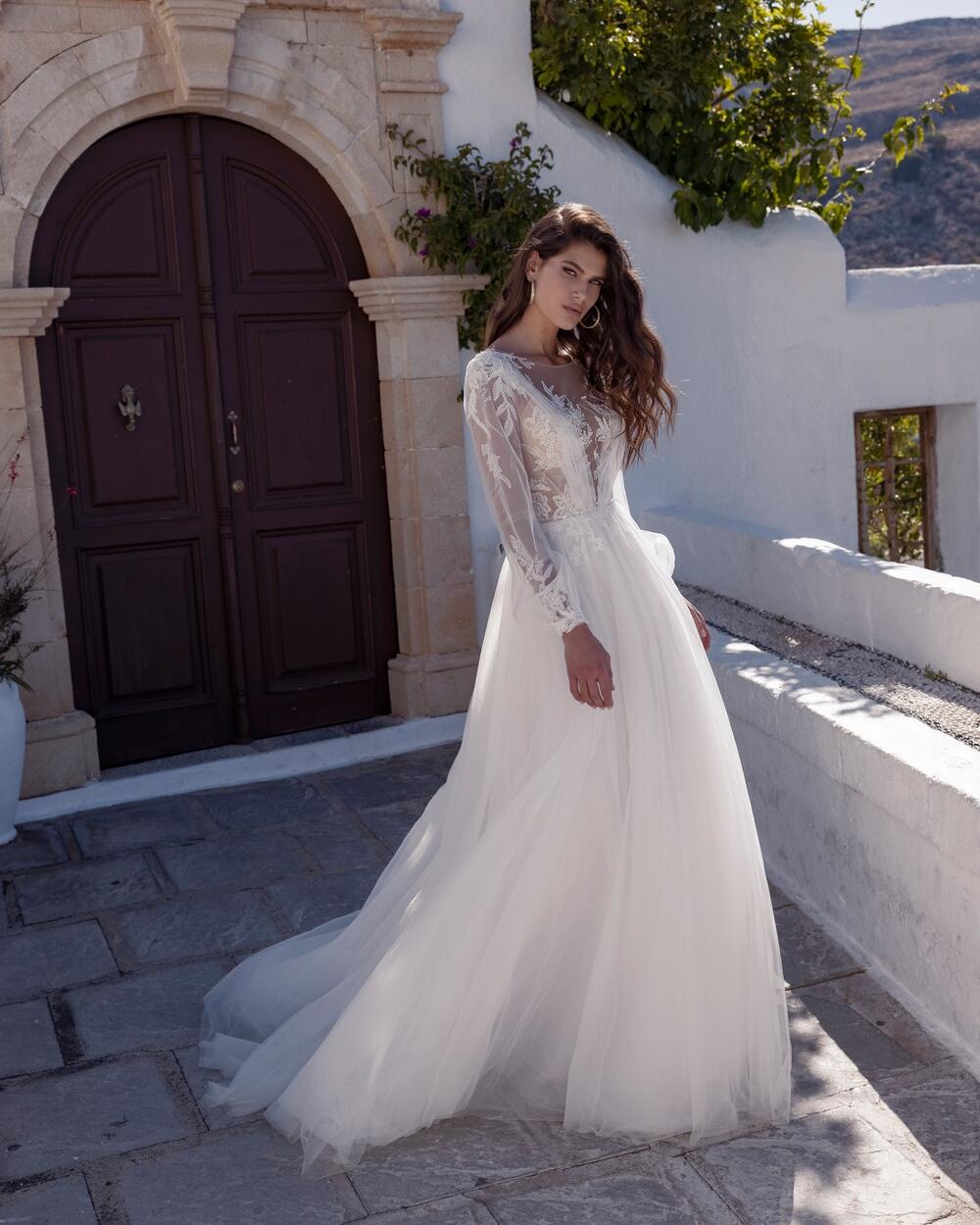 - The SELENA Long Puffy Sleeve illusion plunge v-neck Tulle and Lace A-Line Wedding Dress is perfect for a traditional or modern wedding.