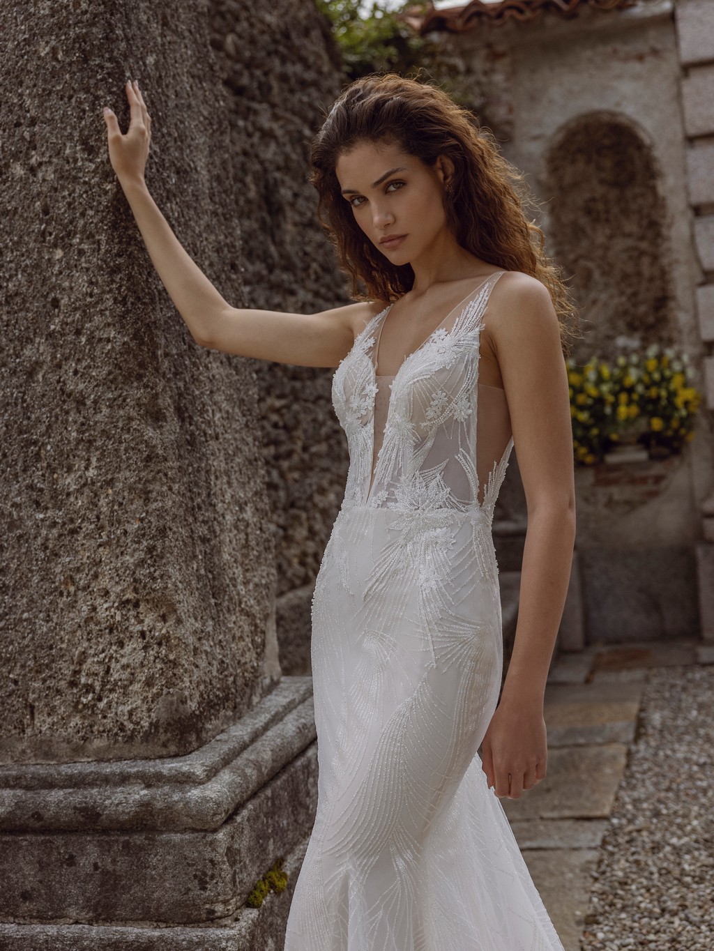 This Turin Deep V-Neck Glitter Tulle Lace Mermaid Wedding Dress is a dream come true for any bride-to-be. The dress is made of high-quality materials that feel soft and comfortable against the skin. The glitter tulle and lace details add a touch of glamour and elegance to the dress, making the bride feel like a true princess on her special day. The mermaid silhouette hugs the curves in all the right places, creating a stunning hourglass figure. The deep V-neckline adds a hint of sexiness, while the long train adds drama and sophistication. This dress is perfect for any bride who wants to feel confident, beautiful, and unforgettable on her wedding day.