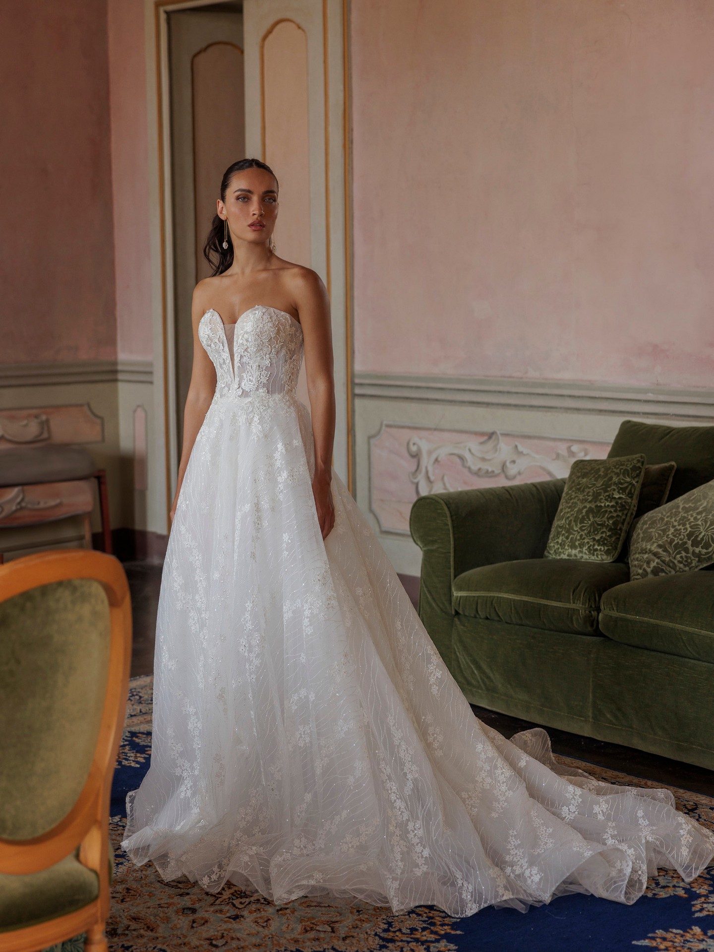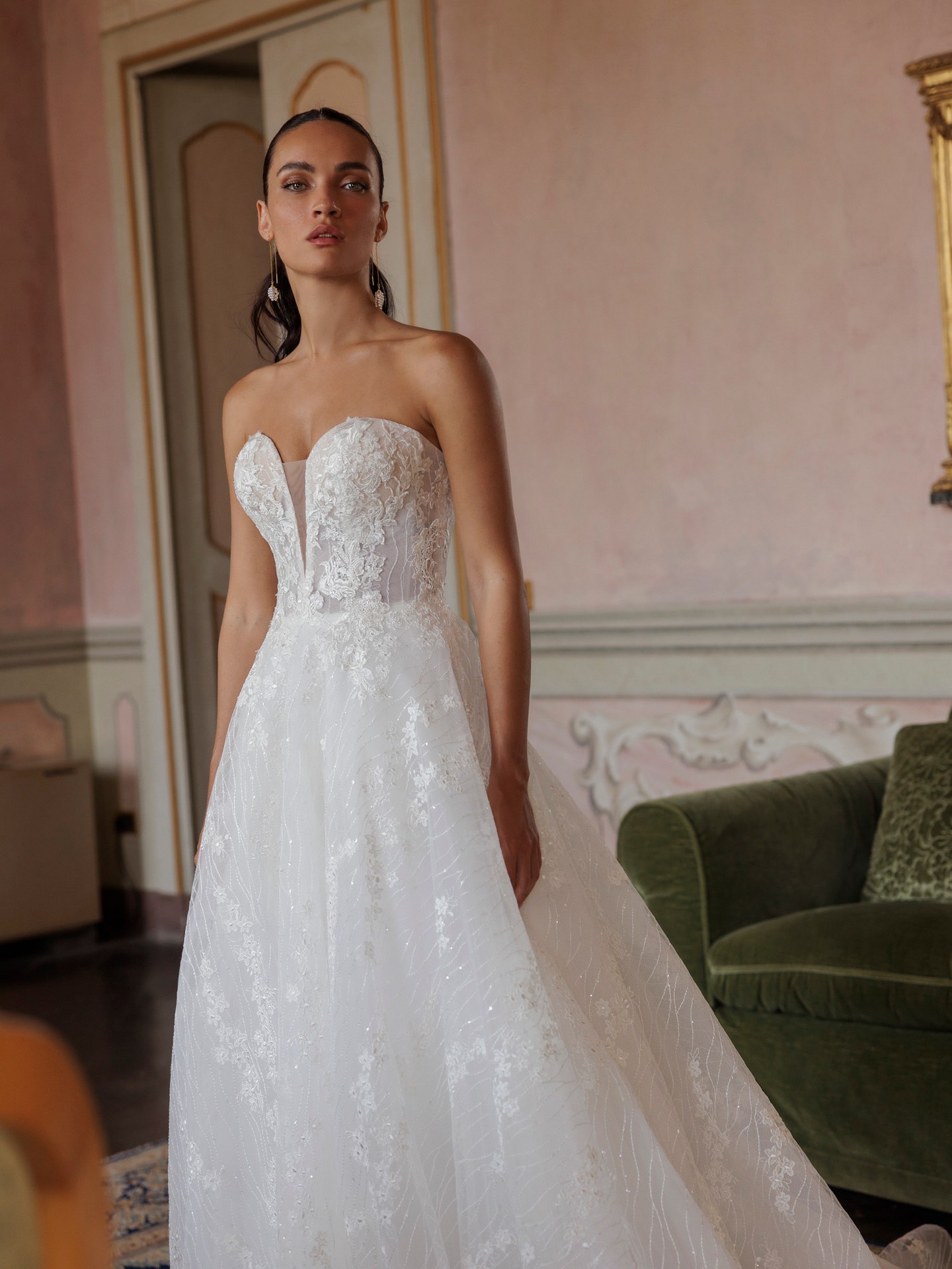 Meet UDA — an elegant, picture-perfect A-line wedding dress designed to flatter every figure. A sculpted sweetheart corset bodice with subtle illusion contouring defines the waist, while heirloom-style lace with a soft shimmer drifts over a cloud-light tulle skirt. The silhouette opens from the waist for graceful movement and finishes in a refined court train that photographs beautifully indoors and out. Wear it clean and strapless or style it with the optional draped off-the-shoulder tulle sleeves for two looks in one.