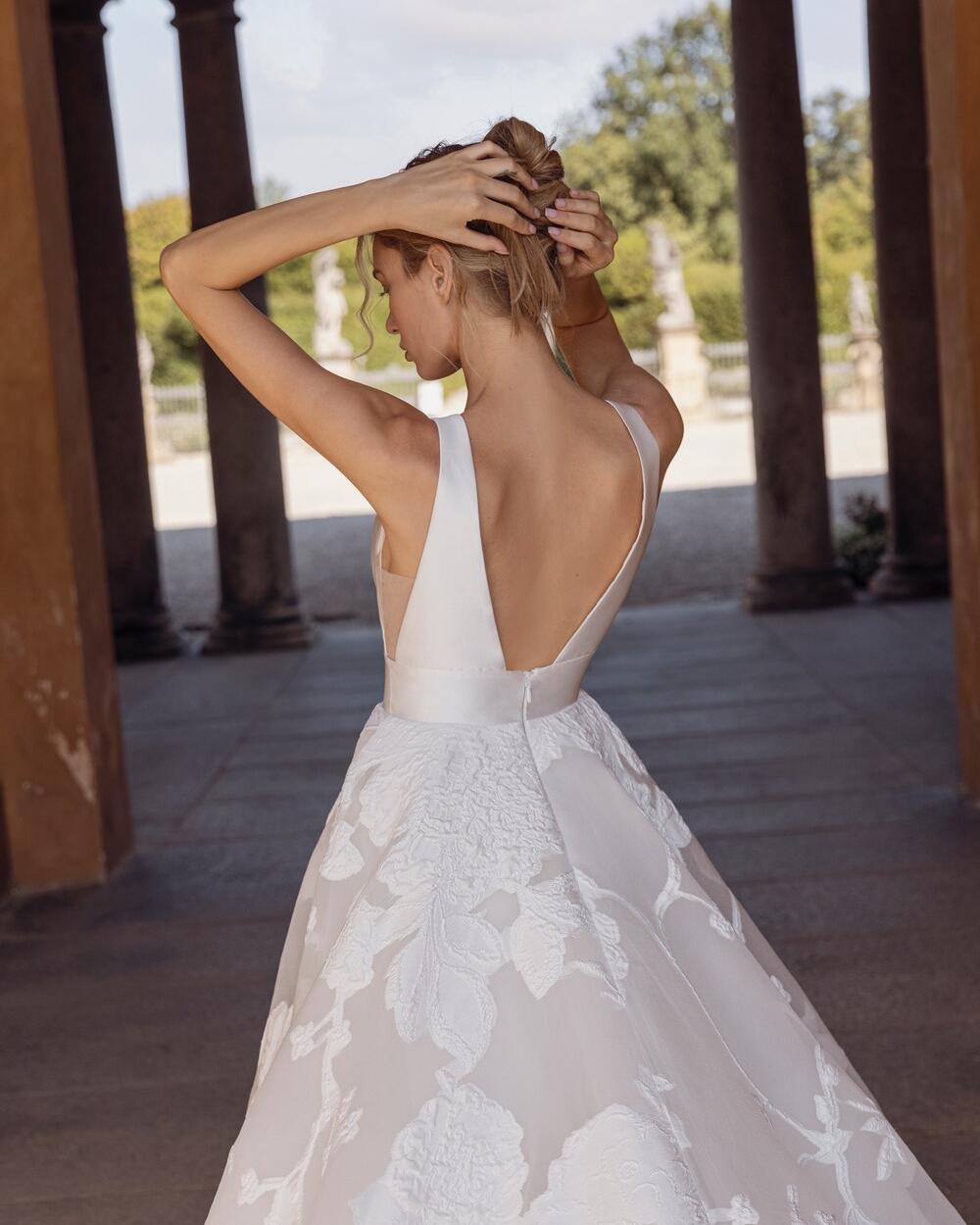This stunning WHISPER V-Neck Mikado and Organza A-Line Wedding Dress is the perfect choice for any bride looking for a timeless and elegant gown. The luxurious Mikado fabric feels soft and silky against the skin, while the voluminous A-line skirt creates a beautiful, flowing silhouette that will make you feel like a true princess on your special day. The delicate organza overlay adds a touch of ethereal beauty, while the deep V-neckline and low back add a touch of modern sophistication. With its classic design and exquisite craftsmanship, this dress is sure to make you feel confident, beautiful, and unforgettable on your wedding day.